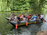 Das Floß Marke Eigenbau hat die zwei Beutezüge mit voller Besatzung unbeschadet überstanden. Für fleißige Paddler standen außerdem den ganzen Nachmittag mehrere Paddelboote bereit, die ausgiebig von den Piratinnen und Piraten durch dich Okerwellen gejagt wurden. Und selbst dass das Wasser nicht nur von unten, sondern in mehreren Schauern auch von oben kam, hat der guten Stimmung nicht geschadet.
