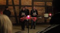 Robert Hehnen mahnte kritisch mit der Weihnachtsbotschaft von Dana Stoll: statt Kriege und Prozesse sollten die Erwachsenen alle nun zur Weihnacht die Welt mit Kinderaugen sehn. Was dann sinngemäß mit den Strophen1,3,6 des Weihnachtsliedes „Ihr Kinderlein kommet“ abgeschlossen wurde.