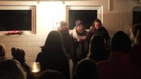 Der Adventskalender, den die Konfirmandinnen Ina und Lena und Nora gestalteten begann in Giesemanns Garage mit dem Lied „Oh du fröhliche“ nachdem Nora die Losung verlas: