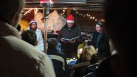 Caus Dieter Cramm las dann die Geschichte vom „wandernden Weihnachtsbaum“, der sich sein Schicksal selber aussuchte, und zu einer armen Familie lief, um sich dann nach Lichtmess im Wald wieder einzupflanzen. Gefolgt von „Es ist für uns eine Zeit angekommen“Â